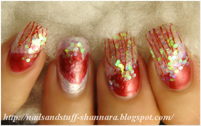 BeantwoordenVerwijderenpretty! i like how each nail is different! and the use of tinsel is nice!